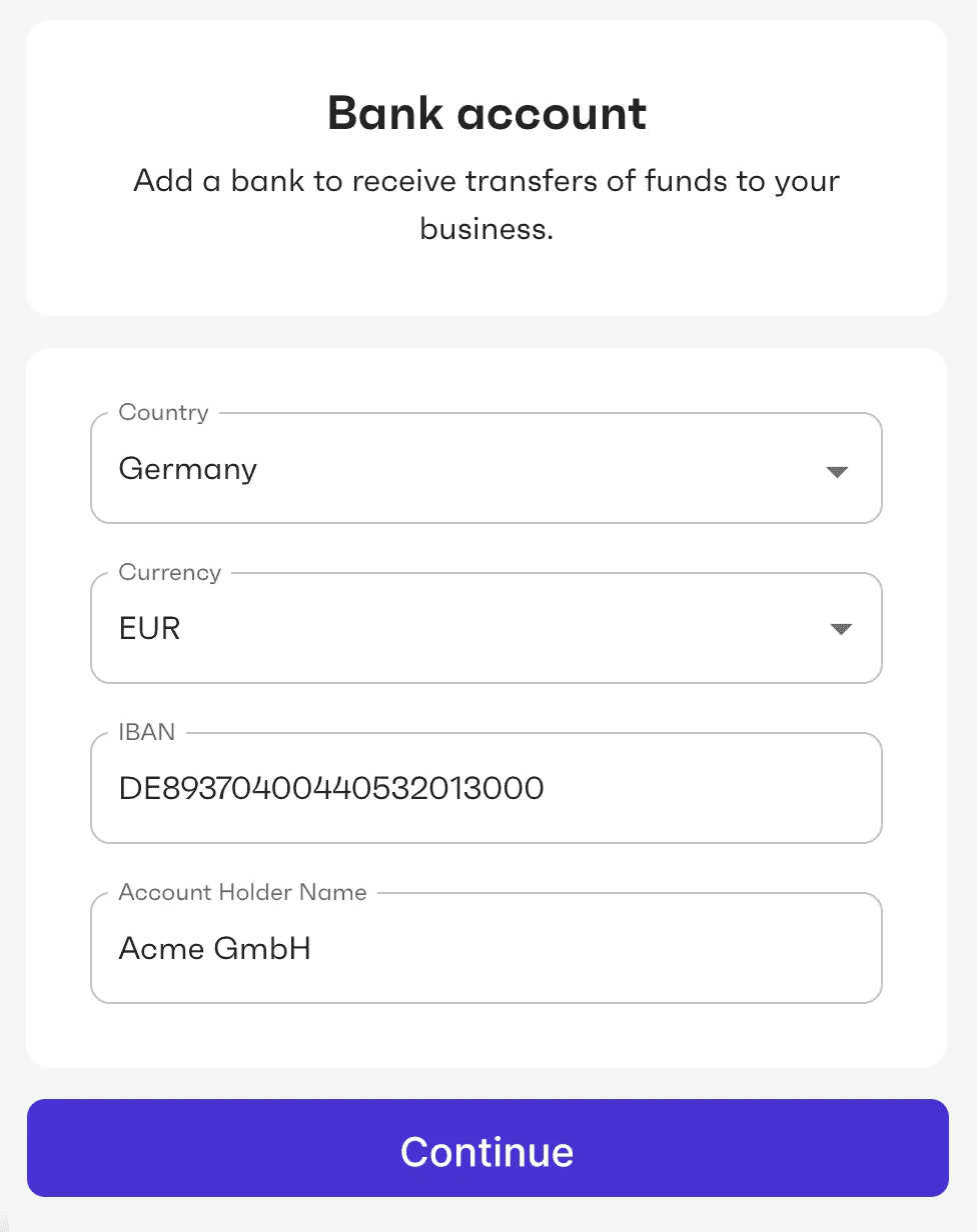 On this screen, the user is asked to provide information about the bank account that the organization will use to make or accept payments. If the organization already has a bank account defined, the screen instead displays the details of that bank account so the user can review them and update if needed.Only USD bank accounts are supported for payments.