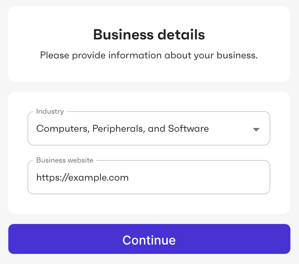 On this screen, the user is asked to specify the Industry and Website of their business.- The industry corresponds to the merchant category code (MCC).