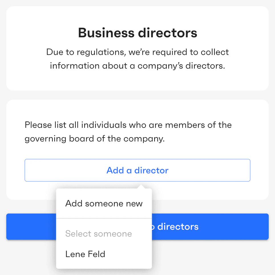 This screen is displayed only for organizations of type “organization”. The user is asked to provide a list of the company’s directors (if any). Directors are typically members of the company’s governing board. Business owners added on the previous screen can be selected as directors if applicable.