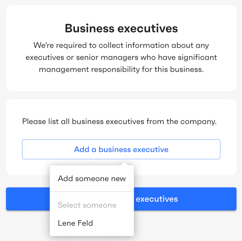 This screen is displayed only for organizations of type “organization”. The user is asked to provide a list of company’s executives (if any). Executives are persons with significant responsibility to control, manage, or direct the business. Business owners and directors that were previously added can be selected as executives if applicable.