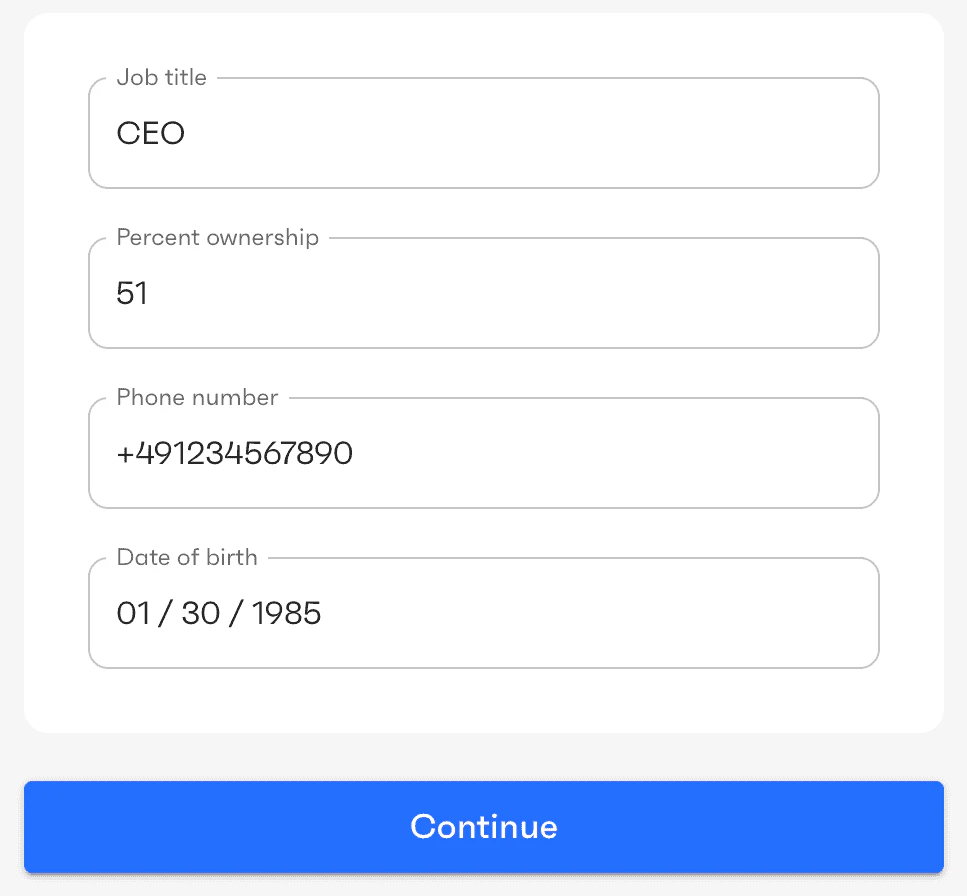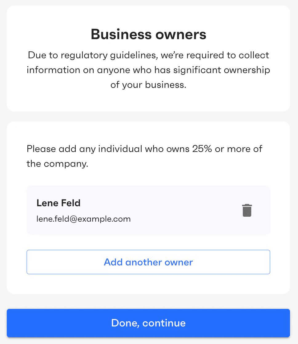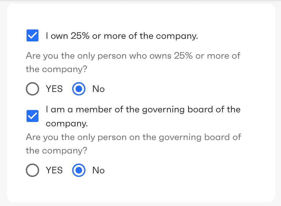 This screen is displayed only for organizations of type “organization” and if the user specified that there are several persons who own more than 25% of the business. The user needs to provide information about other owners of the business. Owners are individuals who either own 25% or more of a company or exercise significant control over it. The latter refers to persons responsible for managing and directing the business, such as executive officers, senior managers, CEO, CFO, COO, President, Vice Presidents, and similar.