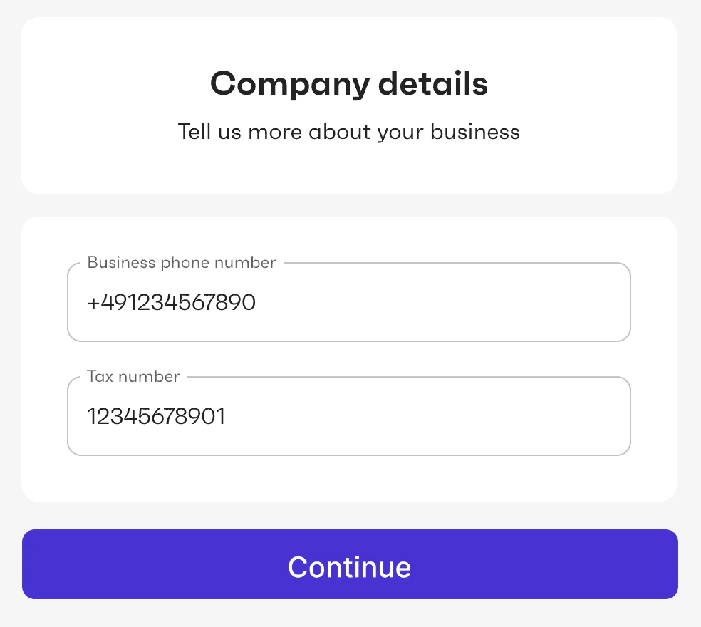 On the first screen, the user is asked to provide one or more of the following: company phone number, company tax number (if applicable), company address. This screen is not displayed if this information was already provided during the organization creation.