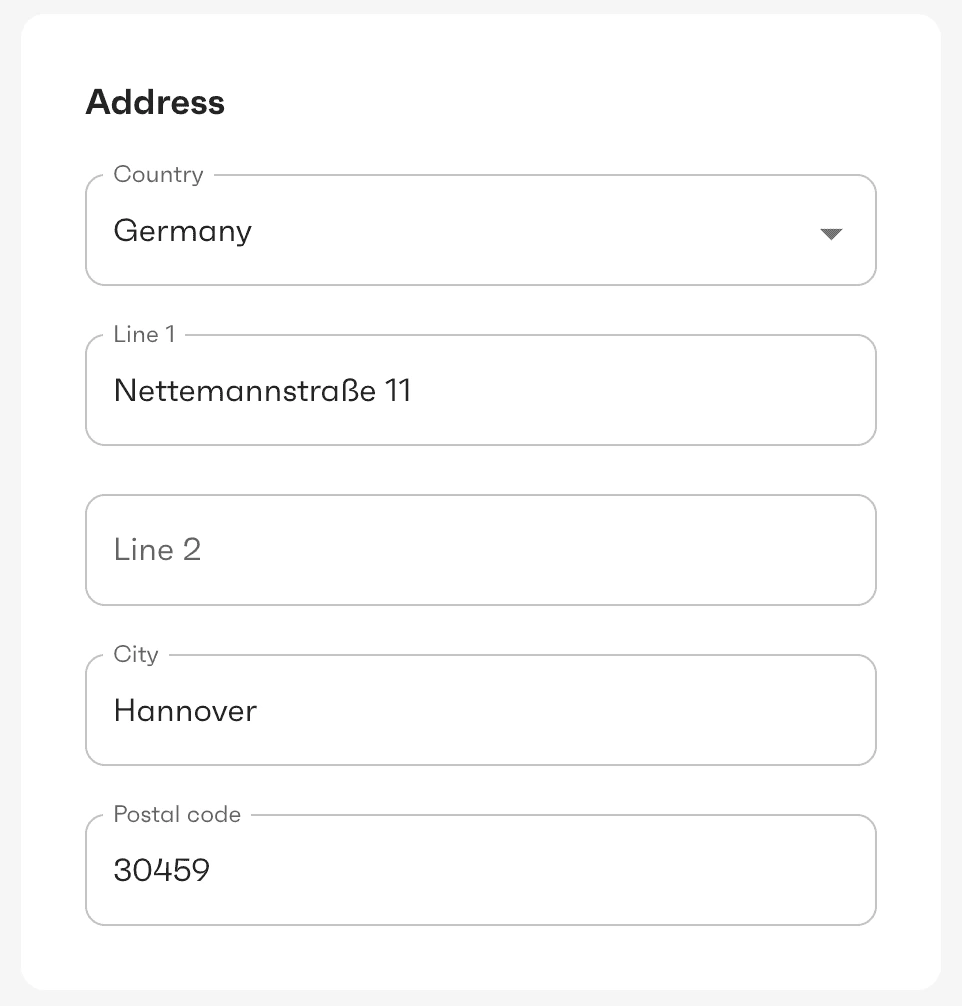 The onboarding UI provided by the component includes several steps. The steps vary depending on the organization type - organization or individual. Some steps and input fields may be hidden if the necessary information has already been provided for the organization (for example, previously provided via API).Company details